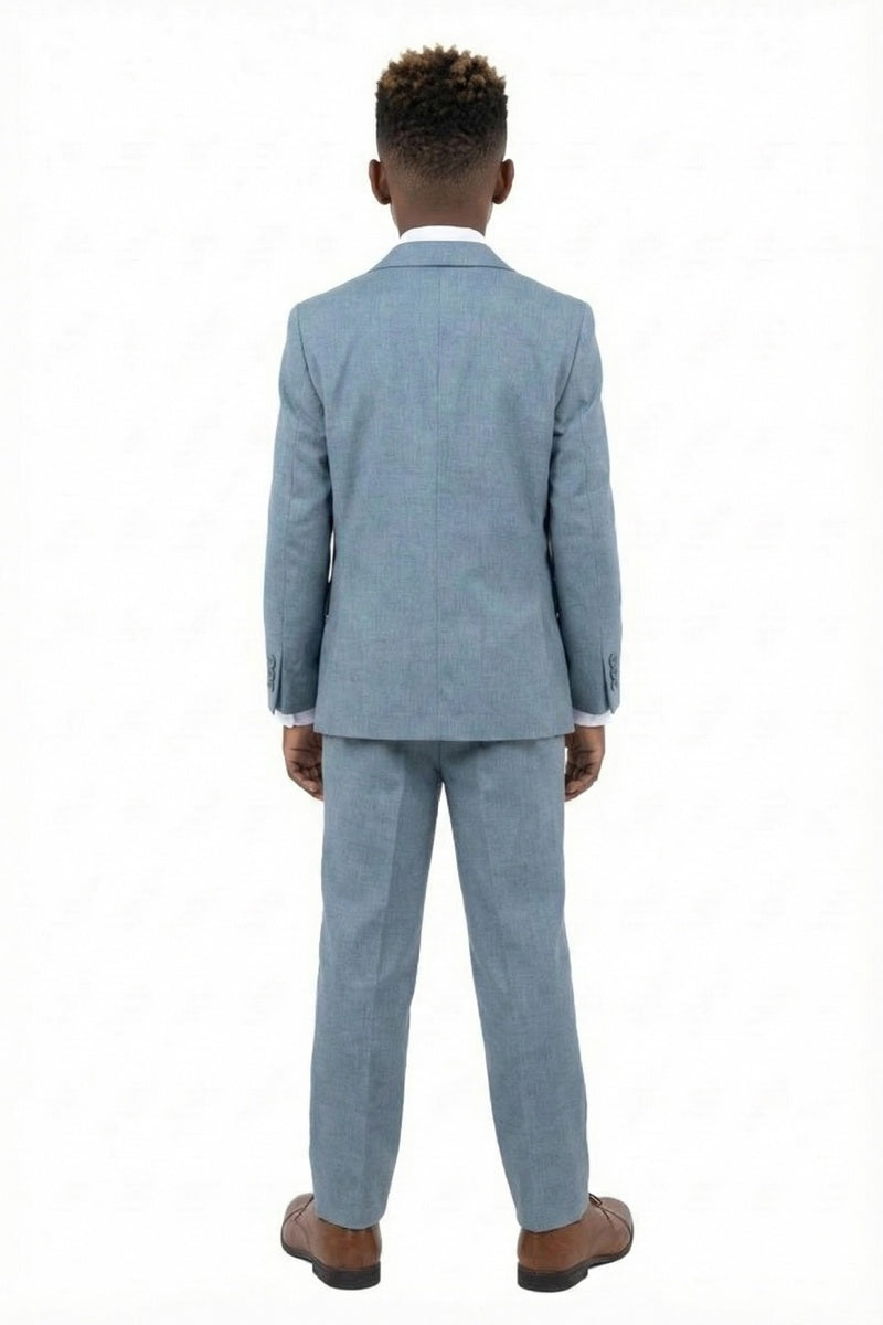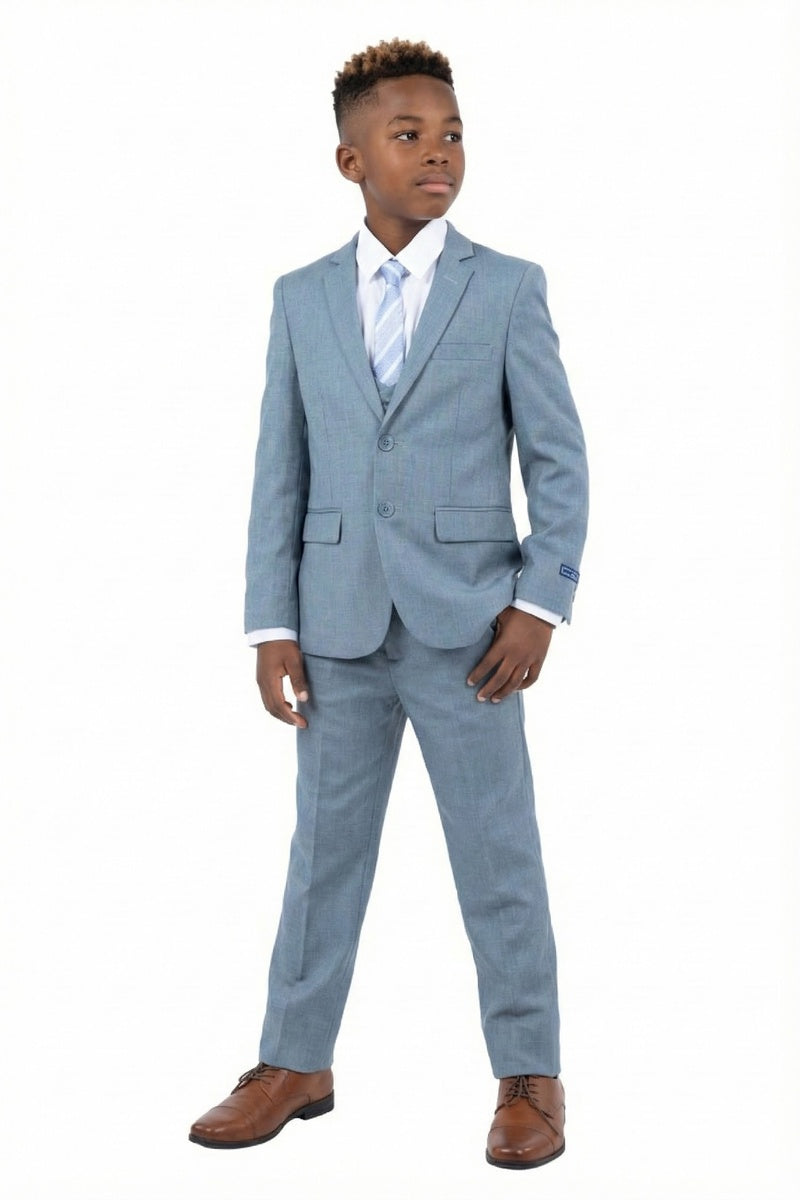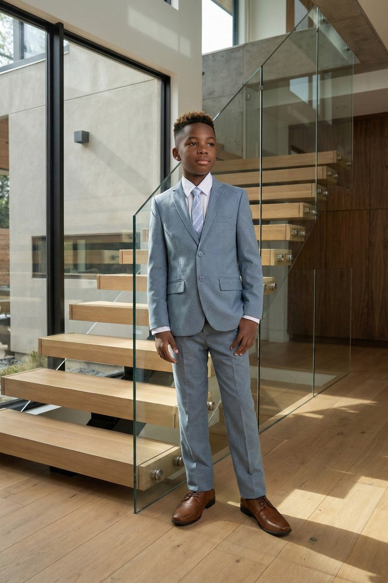The "Sharkskin Swagger" 5-Piece Suit Set, designed by Perry Ellis, is part of our Signature Collection. The 2% stretch is woven into the jacket, pants, and vest fabric to provide additional comfort. Other upgraded features include 3-button vented sleeves on the jacket, french-faced interior lining, and a premium textured cotton blend shirt to elevate the overall look. The expandable waist feature and adjustable vest & necktie were designed to make it easier to fit your little one.